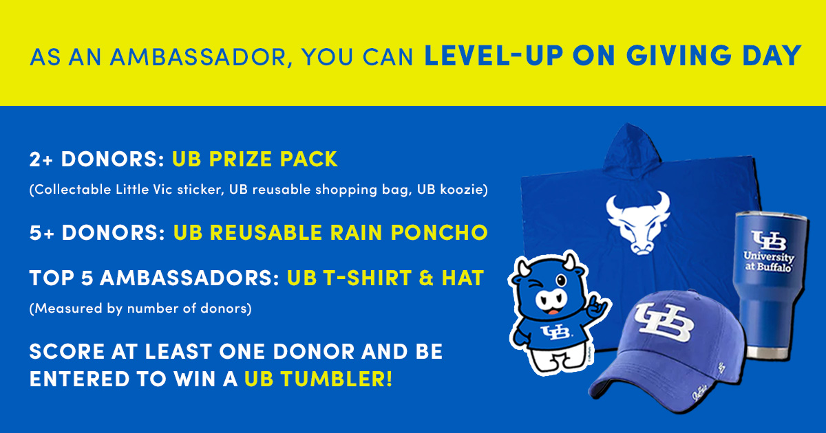 We're excited to bring back the You+2 Program. This is how you'll earn your ambassador exclusive Giving Day prizes! The way it works is simple you sign up to be an ambassador then on Giving Day use your custom ambassador link to get your family, friends and fellow UB Alumni to make a gift of any size to the UB cause of their choice, the more donors you rally the more prizes you can win!