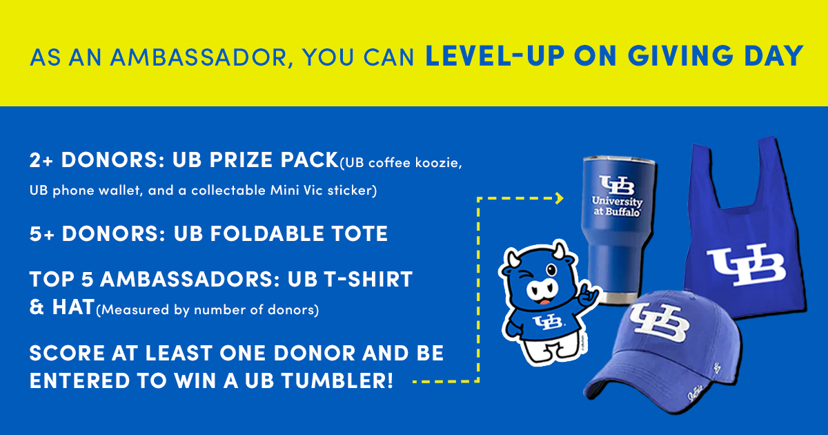 New this year, we're excited to announce the launch of the You+2 Program. This is how you'll earn your ambassador exclusive Giving Day prizes! The way it works is simple you sign up to be an ambassador then on Giving Day use your custom ambassador link to get your family, friends and fellow UB Alumni to make a gift of any size to the UB cause of their choice, the more donors you rally the more prizes you can win!